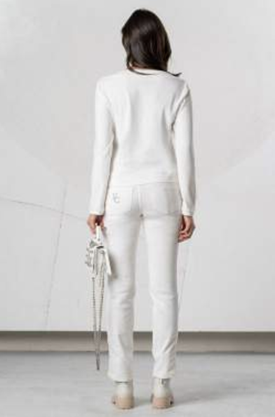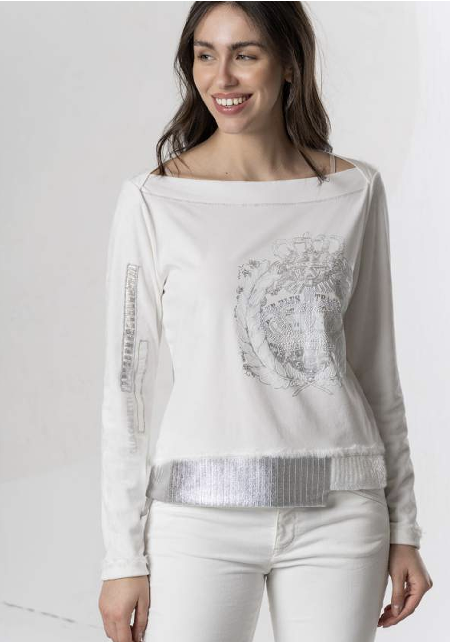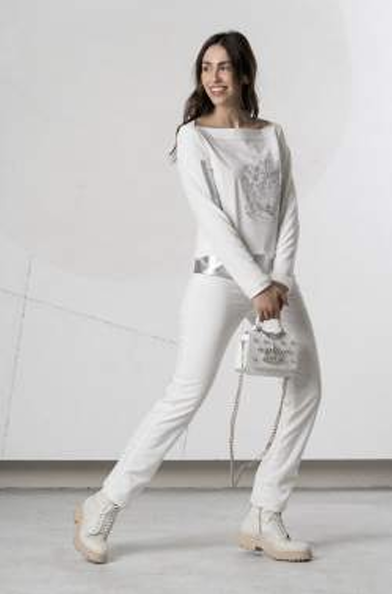 Bluzka Elisa Cavaletti, kremowa bluzeczka z długim rękawem z cienkiej dzianiny wiskozowej, z efektowną srebrną dekoracją z przodu, dekolt łódkowy, fason luźny, długość do bioder, dół zakończony ściagaczem szerokości około 5 cm.