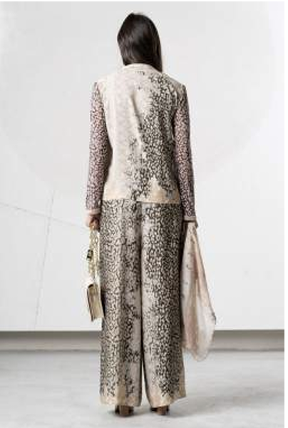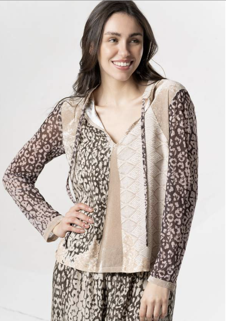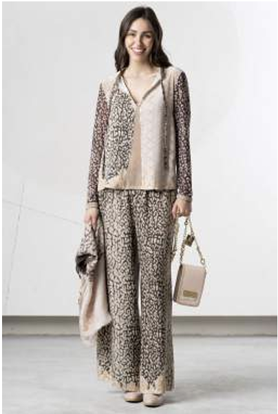 Bluzka Elisa Cavaletti, lekka luźna bluzeczka utrzymana w kolorach brązu beżu i pudrowego różu, na małej stójce wiązana pod szyją, rękaw długi, dół prosty luźny, motyw wzoru panterka . Do kompletu mamy spodnie luźne proste z tej samej tkaniny - razem tworzą wygodny i stylowy zestaw.