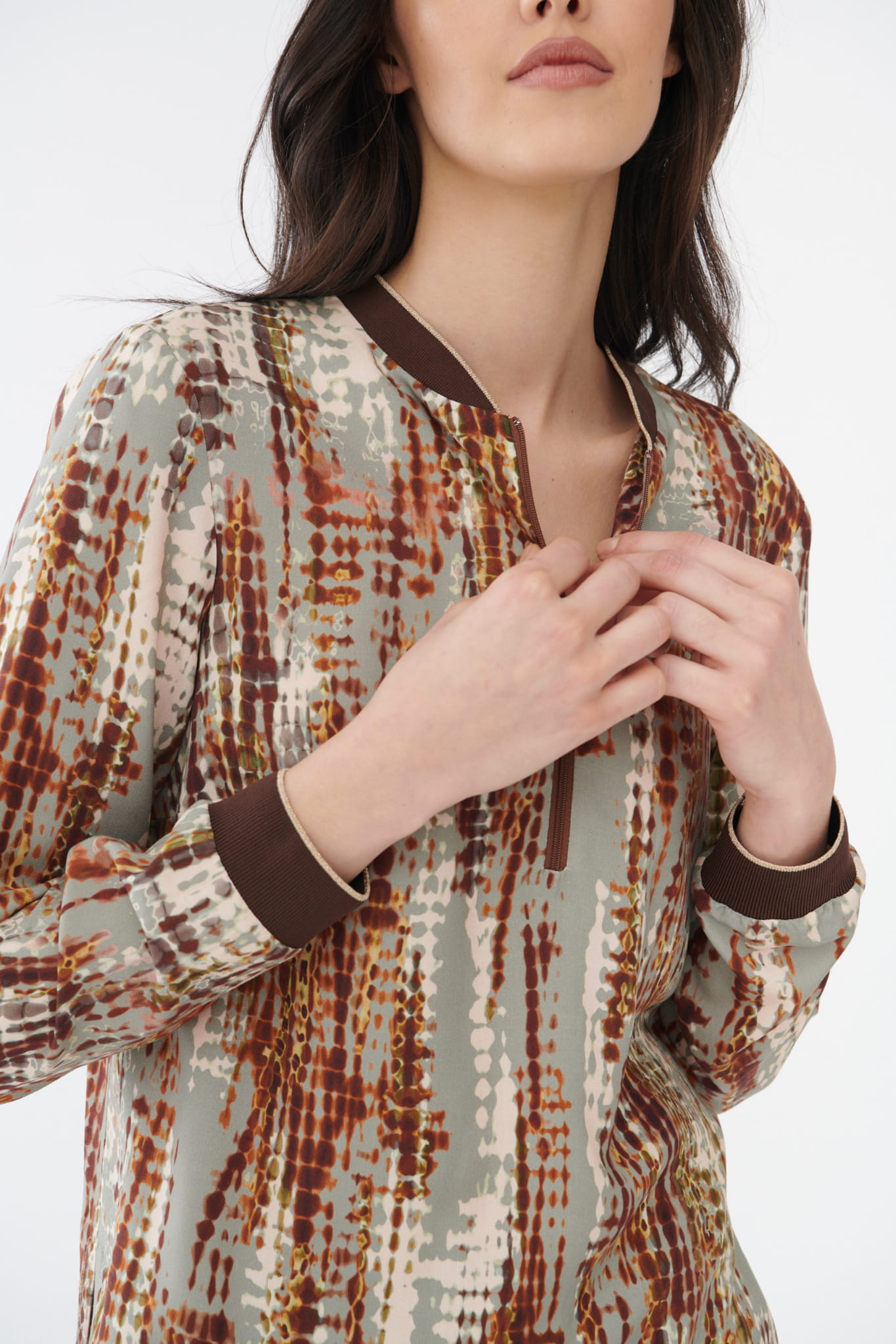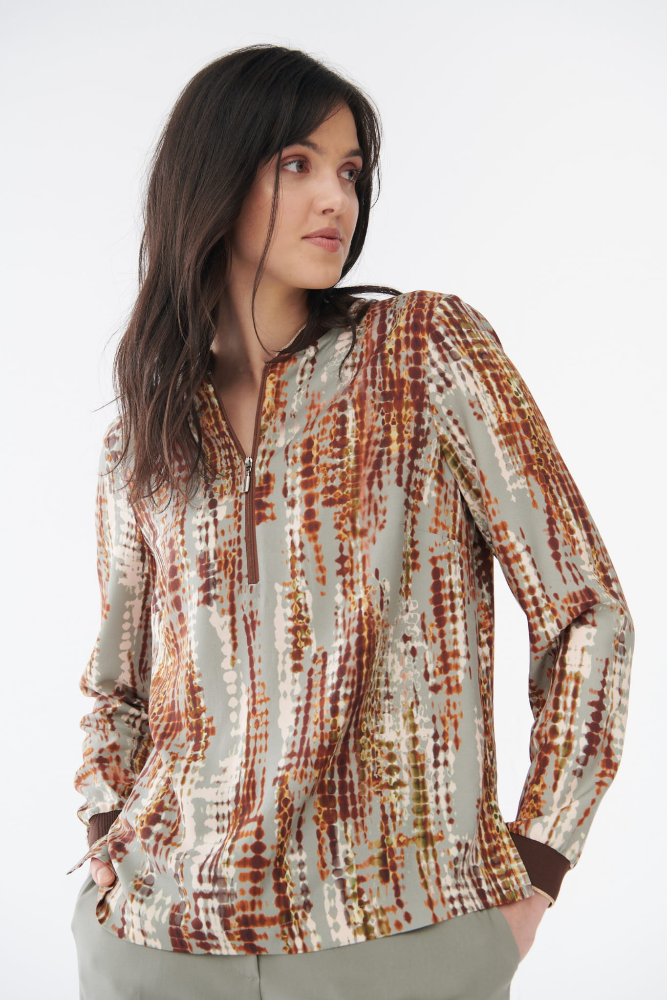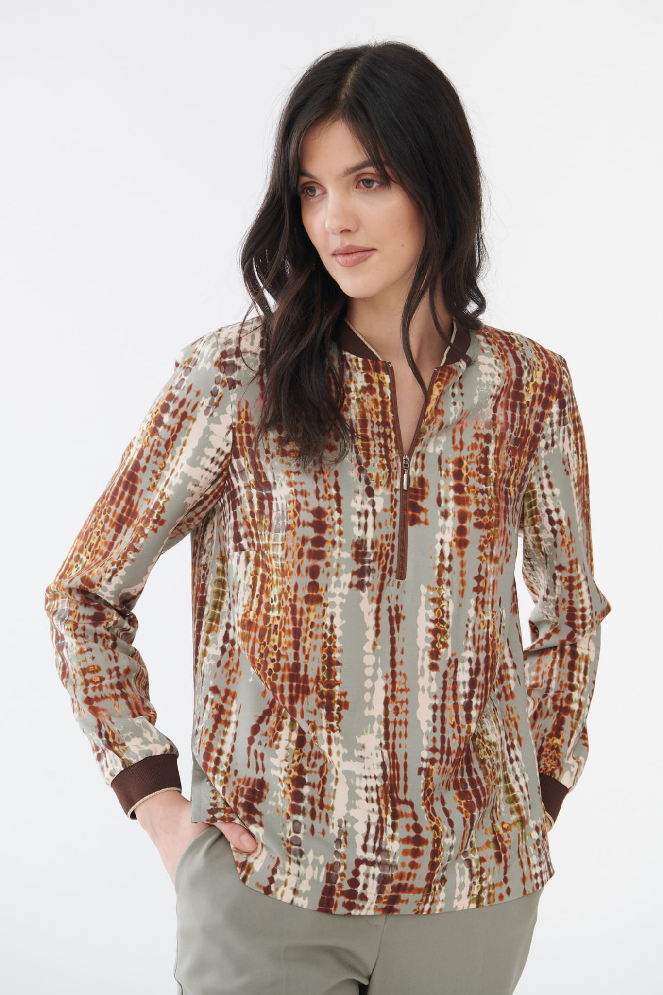 Bluzka Feria, wiskozową bluzeczka w kolorach jesieni - oliwka, brąz, krem, beż - zapinana pod szyją na zameczek, wykończona delikatnym dekoracyjnym ściagaczem przy szyi i rękach. Tkanina drukowana w obstrakcyjny print.