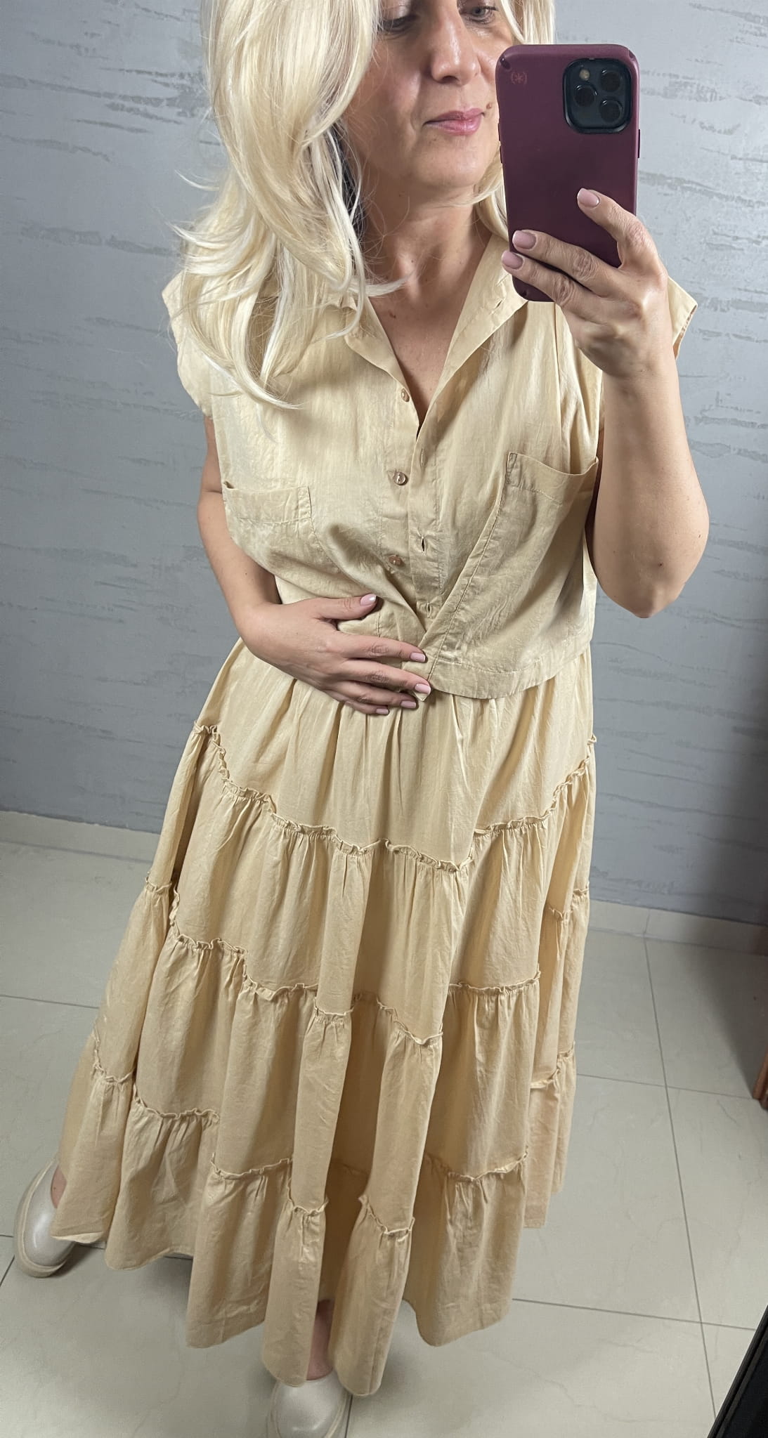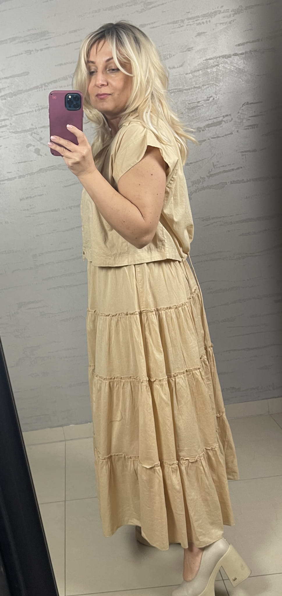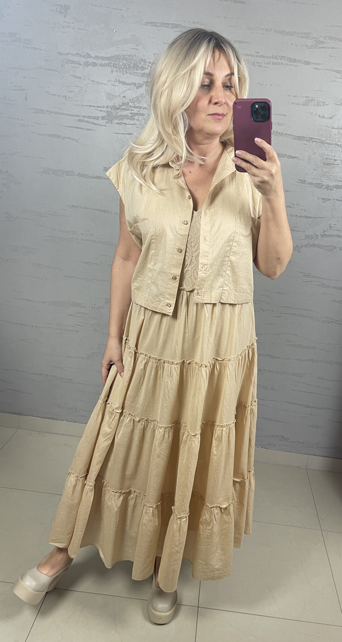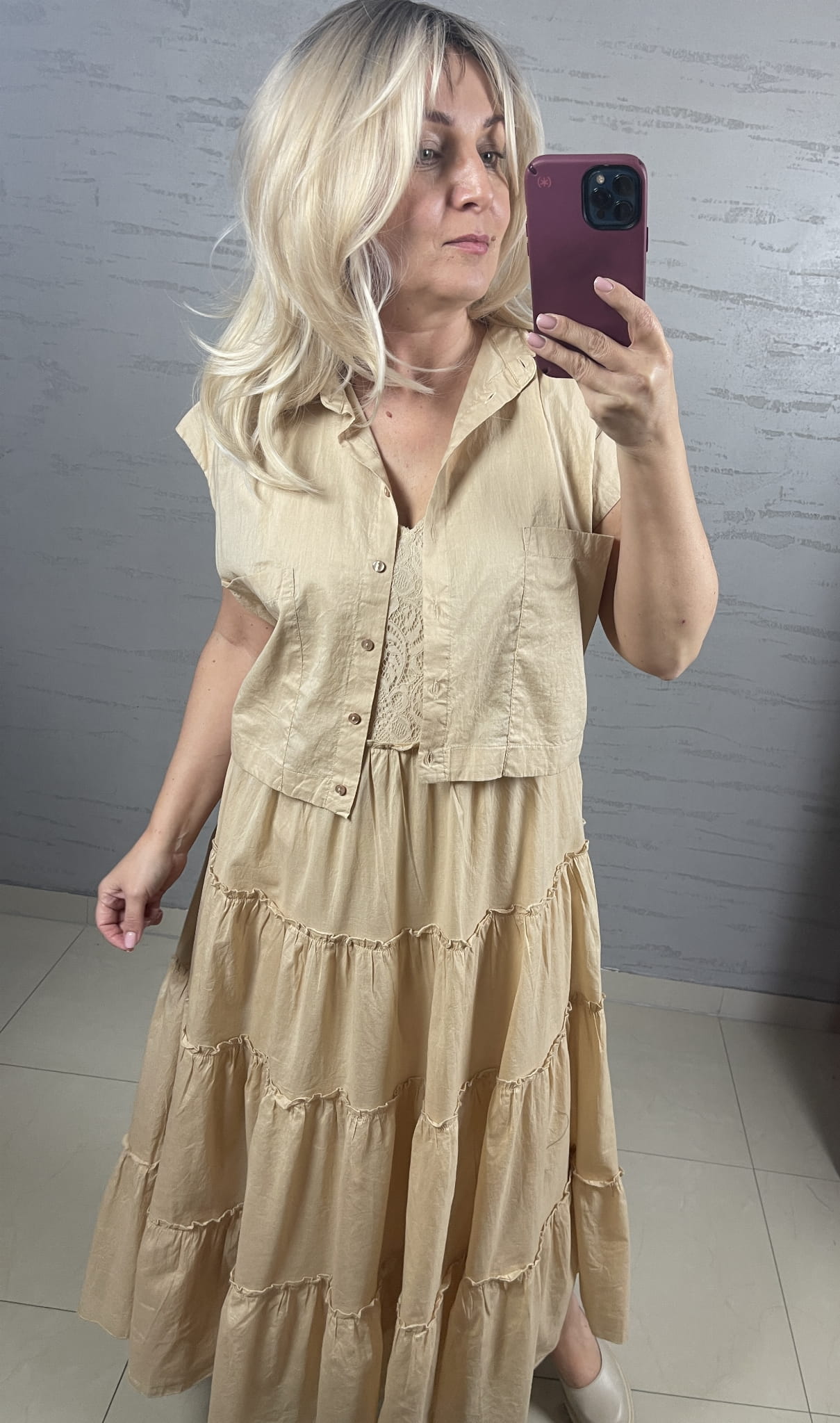Bluzka NU Denmark w kolorze pszenicy z delikatnej bawełny, fason szeroki pudełkowy, zbierany dołem sznureczkiem, forma pudełkowej koszuli z małym kołnierzykiem ze skośnym minimalnym rękawkiem, zapinana na drobne guziczki, może być noszona ze spodniami, z szortami ze spódnicą oraz może być formą bolerka - żakieciku do sukienki z tej samej bawełny w tym samym kolorze.