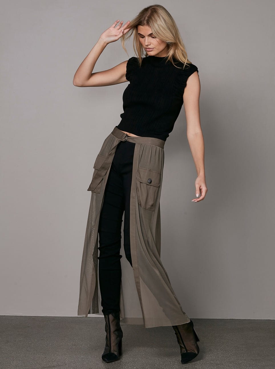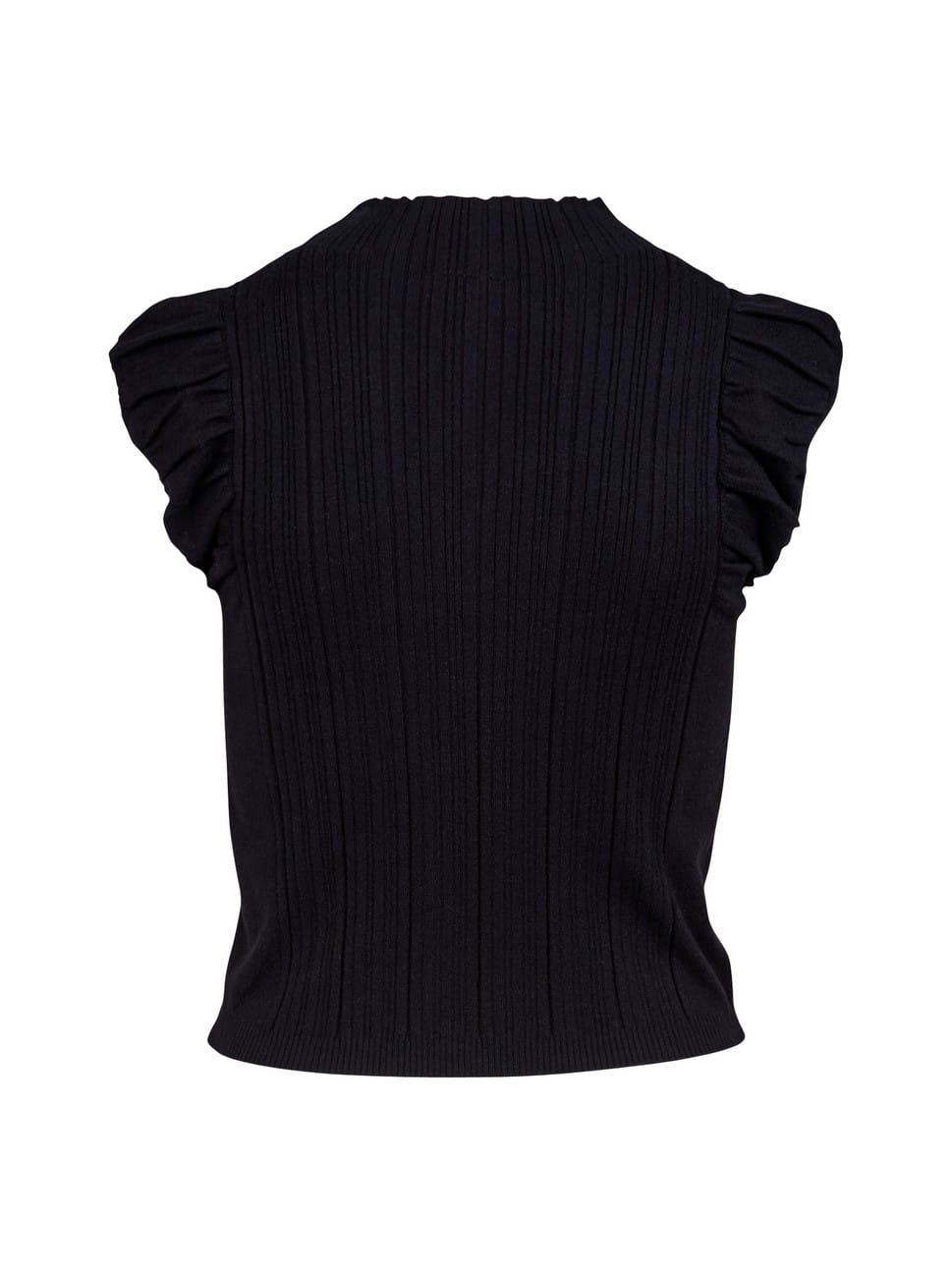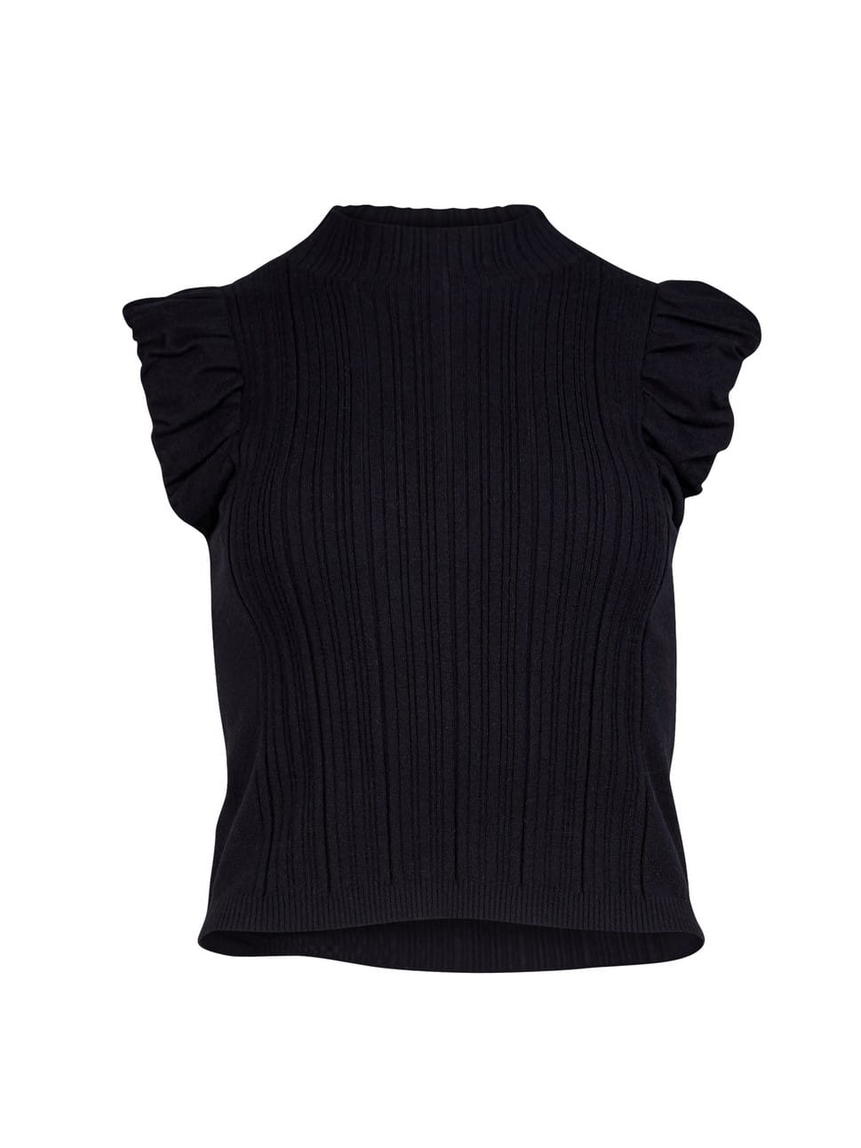 Bluzka NU Denmark, świetna prążkowana bluzeczka o strukturze sweterkowej, wykonana z mięciutkiej dzianiny na bazie wiskozy. Kolor czarny, przy szyi przylega jak półgolfik, rękawek krótki, skośny/lekkie kimono, zakończone małą falbanką. Model bardzo rozciągliwy.