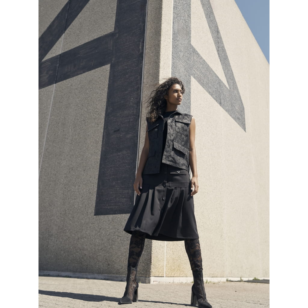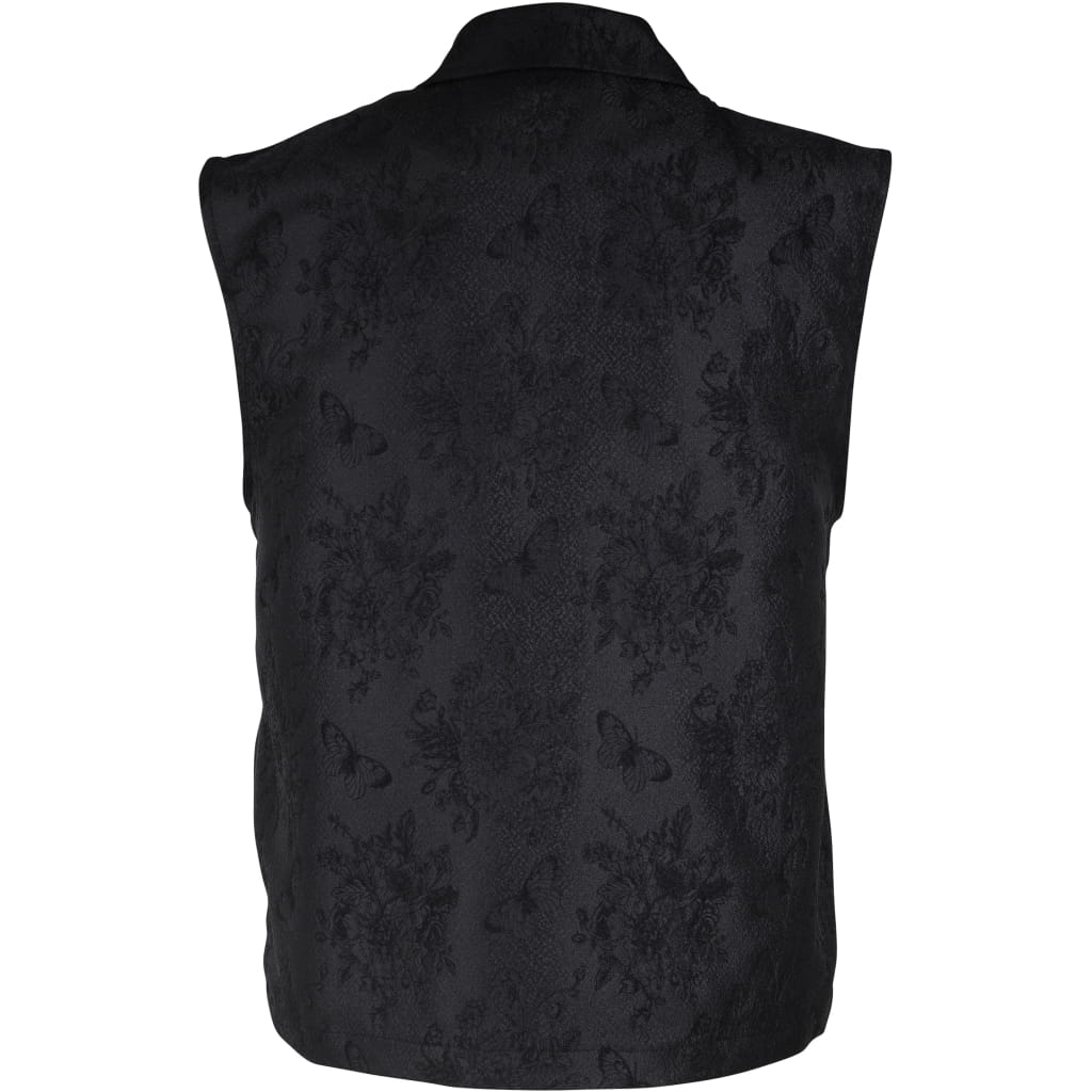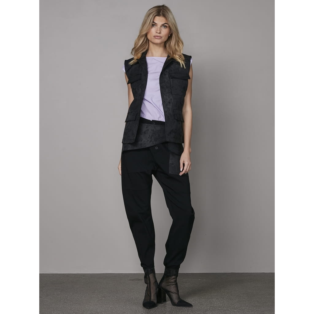 Kamizelka NU Denmark, czarna żakardowa luźna kamizelka o fasonie sportowym, duże naszywane kieszenie, model nietaliowany, do kompletu do spodni czarnych ze skośnym dekoracyjnym doszyciem . Zestaw modowy oryginalny.