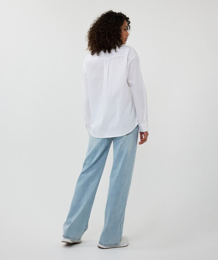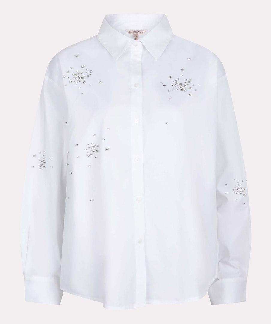 Koszula Esqualo biała z kamieniami, luźna koszula klasyczna z kołnierzykiem i mankietami, odszyta z bawełny, ma dekoracyjne srebrne drobne kamienie naszyte z przodu co dodaje jej wyjątkowości. Idealna do jeansow, do szerokich spodni. Z tyłu na plecach jest zakładka, co powoduje , ze koszule wypadają dość luźne.