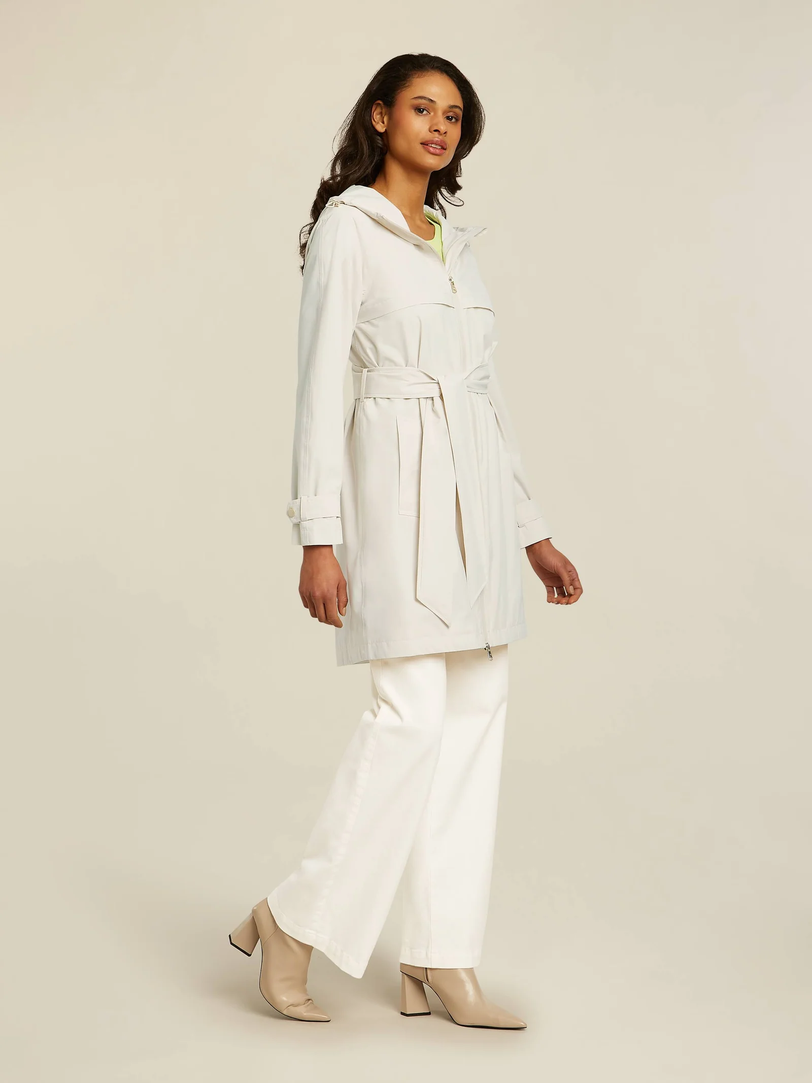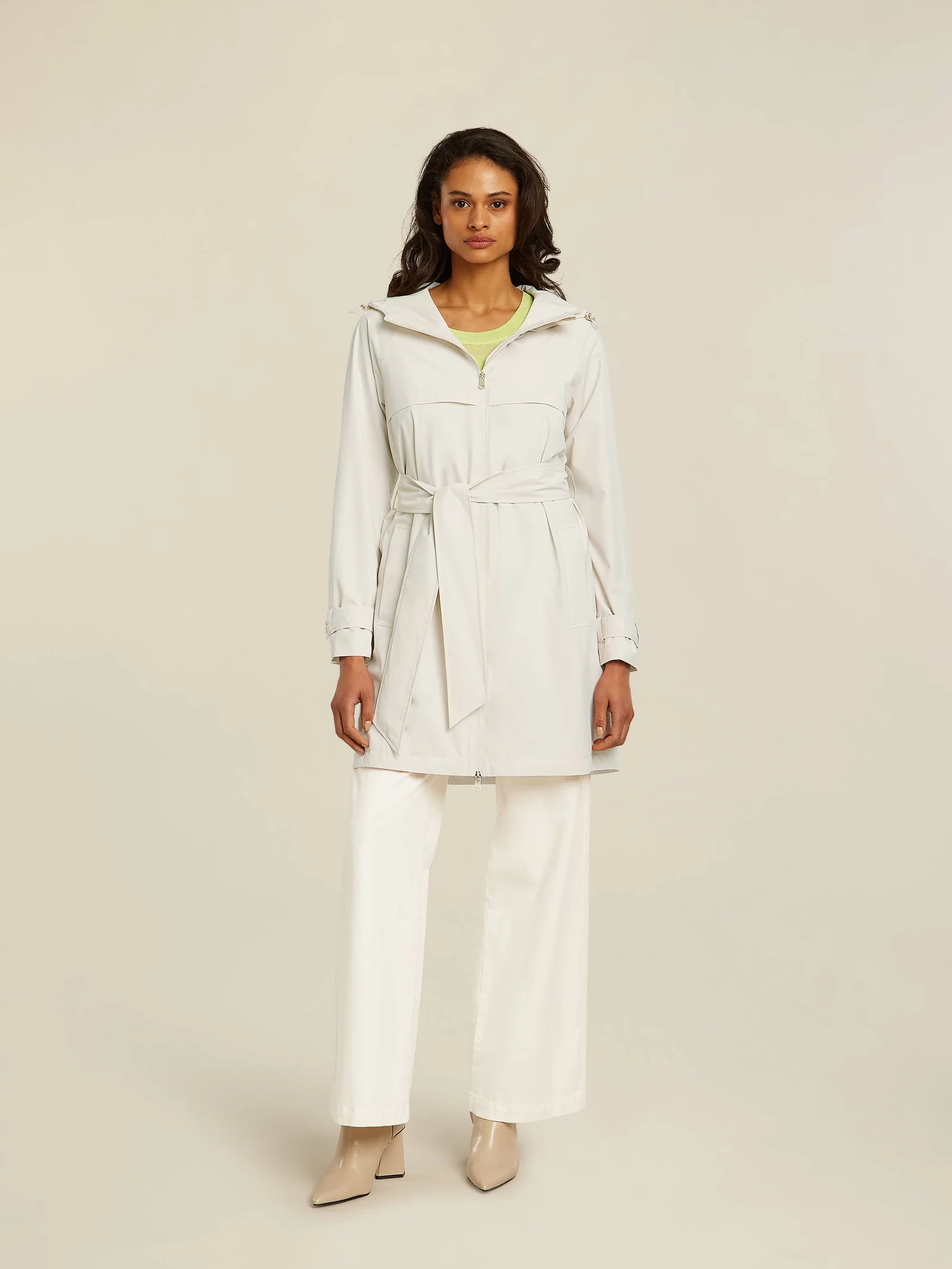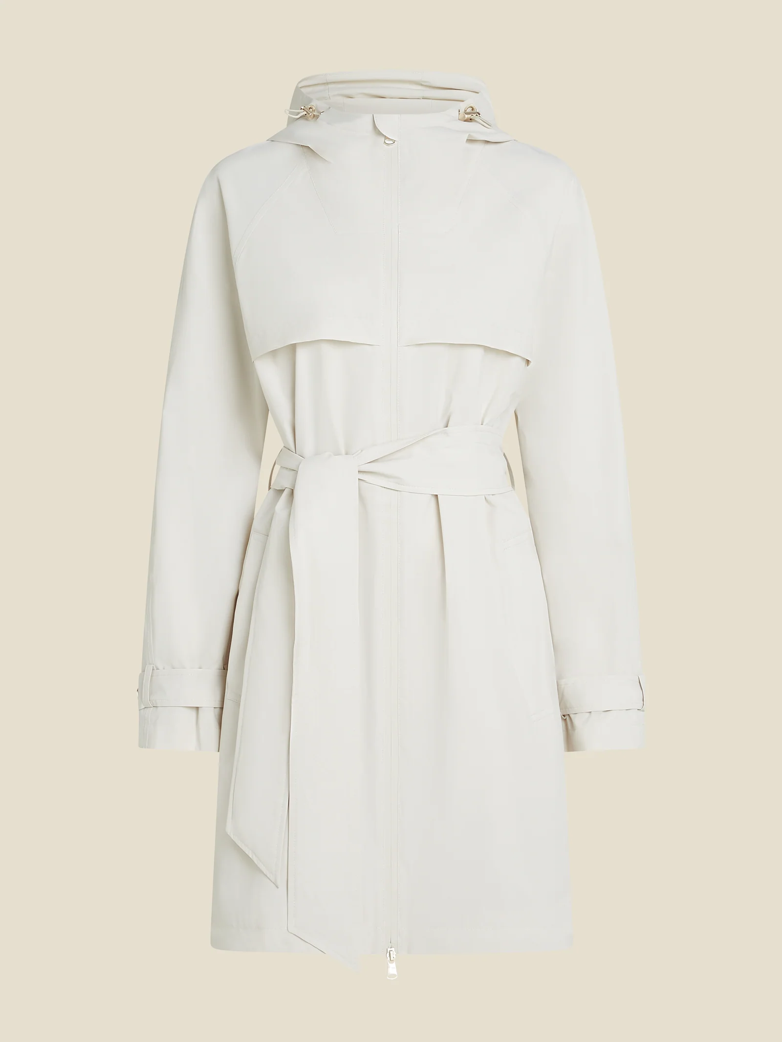 Płaszcz przeciwdeszczowy Beaumont, pięknie wykonany, niezwykle lekki płaszczyk przeciwdeszczowy wykonany z technicznej tkaniny membranowej, zapinany na suwak, wiązany w pasie paskiem, z kapturem , długość około 90-95 cm w zależności od rozmiaru, kolor kremowy.