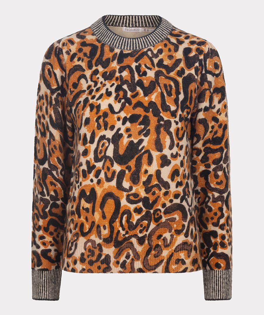 Sweter Esqualo, milutki ciepły sweterek w panterkowe wzór w odcieniach pomarańczu, brązu i kremu. Fason prosty luźny, dekolt okrągły zakończony ściągaczem,