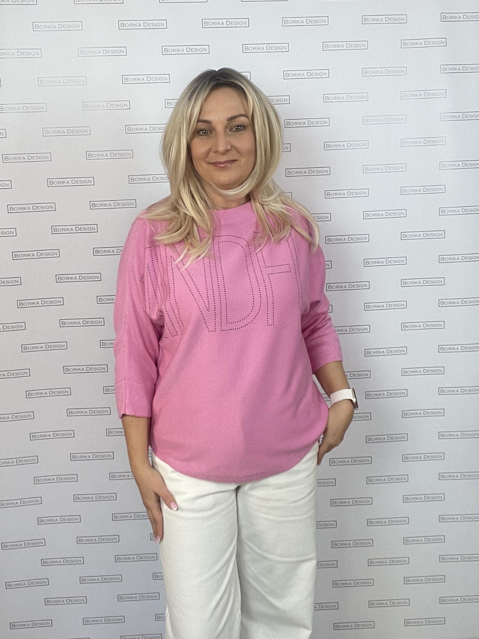 Sweter różowy Kenny S - różowy sweterek kimonowy z milutkiej i mięciutkiej dzianiny, 3/4 długość rękawa, dekolt okrągły, delikatna dekoracja z przodu w postaci napisu z grafitowych drobnych kamyczków