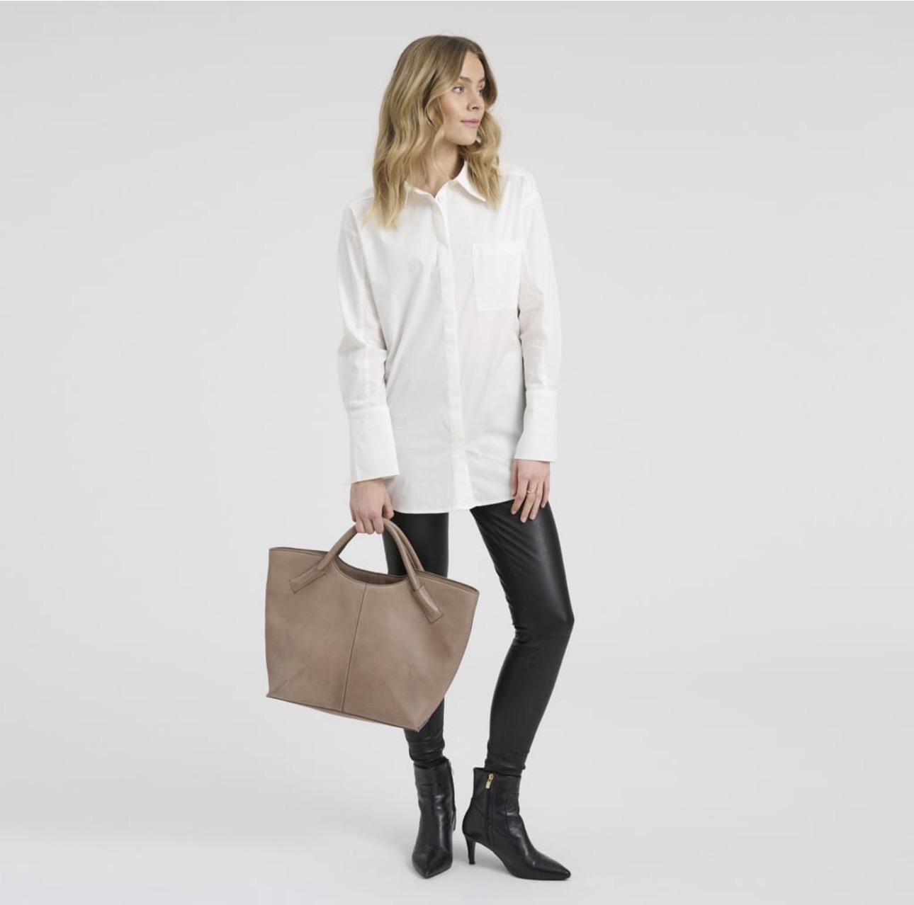 Torebka Depeche Shoper Taupe - przepiękna duża torebka ze skóry naturalnej w kolorze taupe, zaprojektowana tak aby trzymać ja w dłoni ale wyposażoną ja rownież w długi pasek . Główna komora wyszyta jest bawełnianą podszewką w tym samym kolorze co korpus torebki i skonstruowana w ten sposób aby tworzyć ściągany worek zabezpieczający zawartość torebki. Model sztywny - nie workowaty, trzyma swój kształt na stojąco.