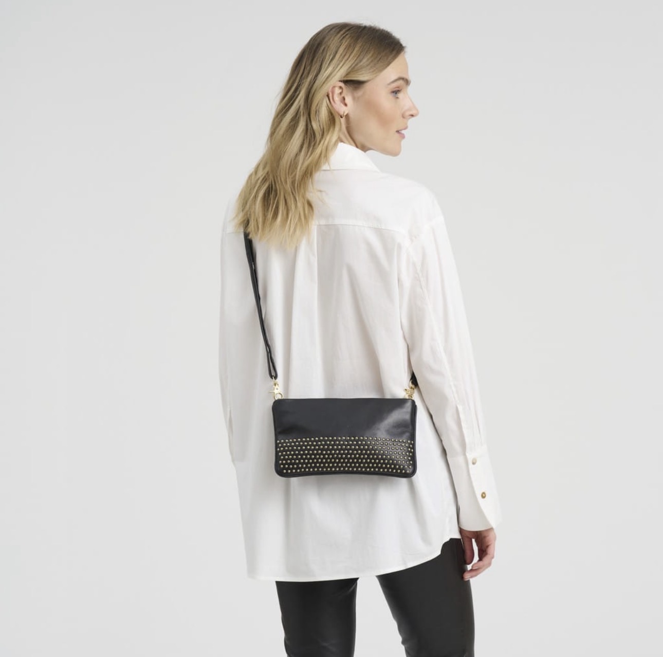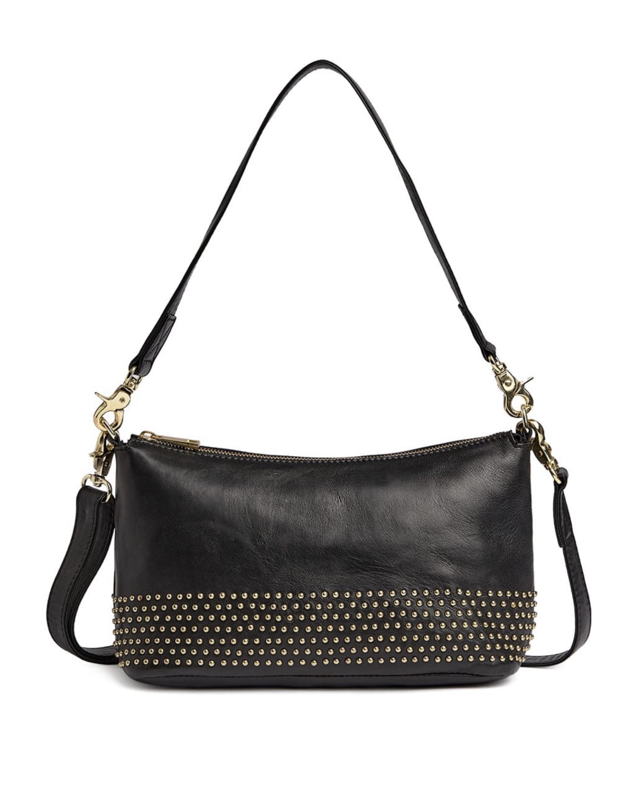 Torebka Depeche - mała czarna torebka z ekskluzywnej skóry, kopertówka, z długim paskiem i krótkim do przełożenia przez dłoń, zapinana na zamek,